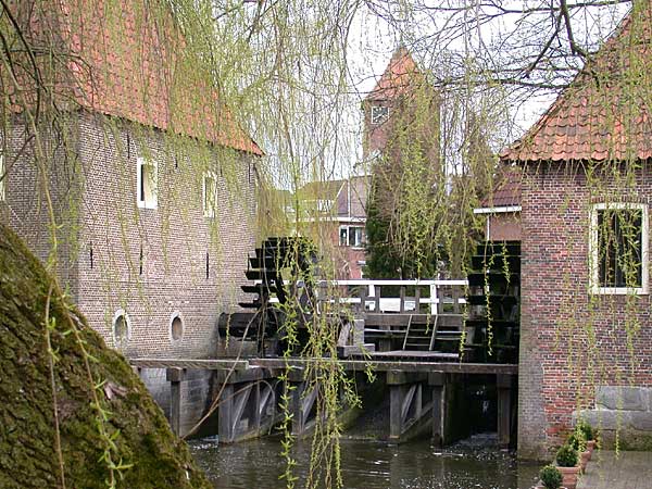 | De watermolen van Borculo aan een zijtak van de Berkel is ouder van 1552. De korenmolen had drie draaiwerken en de oliemolen twee. |