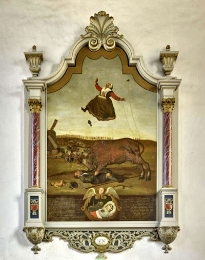 de botsing tussen een stier en een boerin vastgelegd. In de Bullekerk,